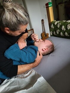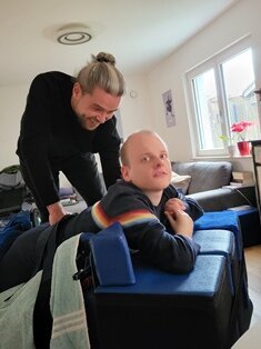 Seid Oktober erhält Elias Neuro Scan Balance (NSB)-Therapie. Mittlerweile nimmt er öfters den linken Arm und seine Hand zur Hilfe, sein Rücken ist lockerer und er dreht sich leichter auf beide Seiten.